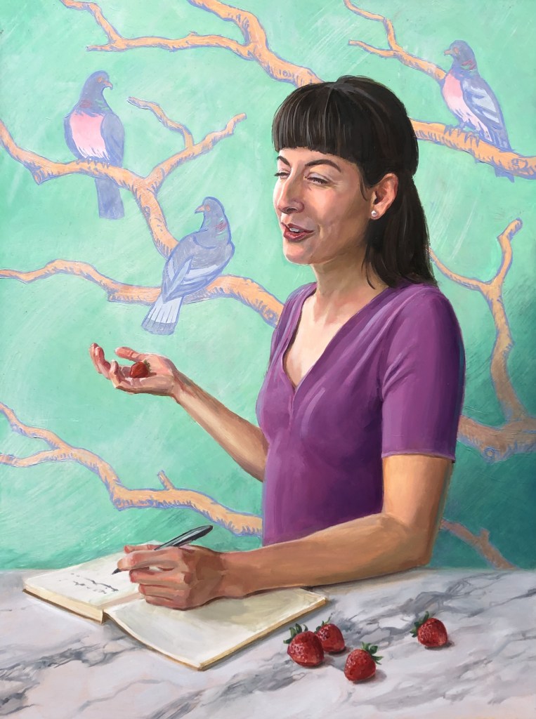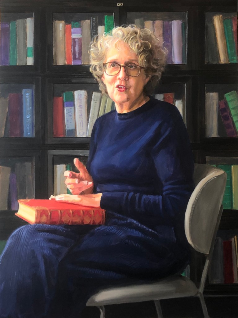 ‘An amazing portrait of me in mid stammer. I was so pleased Paul asked me to have my portrait painted. I hope what comes through is a strong, determined woman who says what she wants, not apologising for her stammer.It’s the way I talk and if you don’t like it that is your problem. As many of you know I am a feminist, the colours of the books in the background are the suffragette colours.