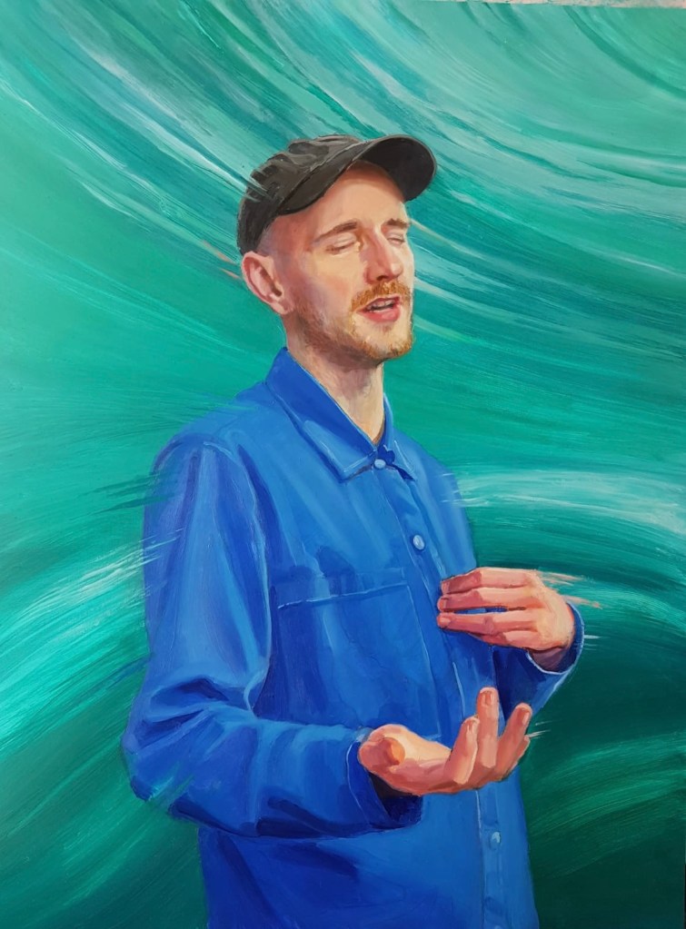 ‘I was honoured to be asked by Paul to have my portrait painted. At the time, we were discussing a stammering pride flag we recently created with other people who stammer. The flag is inspired, amongst other things, by the work of poet and writer Jordan Scott, who compares the unpredictable nature of stammering to water: “I talk like a river”. I wanted this to be reflected in all aspects of the portrait: from the inclusion the sea-green and ultramarine blue to the presence of water, waves and currents.