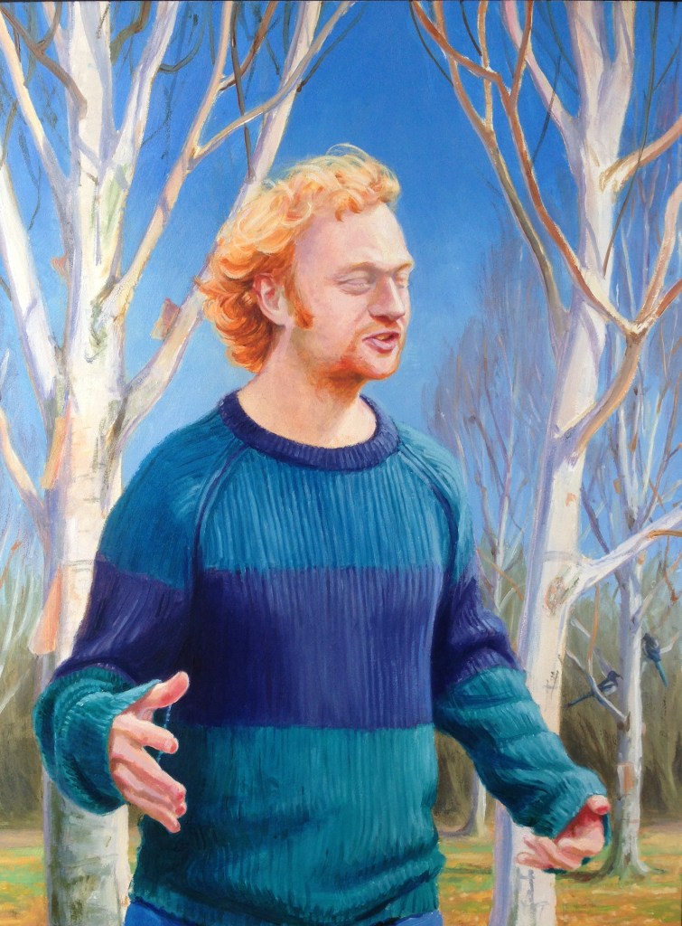 In the background, you may notice a magpie or two sitting among the birch trees. I wanted my northern roots to be a part of the picture as well as my stammer. The magpie is Paul’s representation of this symbol (the symbol of Newcastle United football Club). The birch trees are Paul’s idea too. A pioneer species that often starts off a new woodland. Make of that what you will, apparently the original black pines of the park were too difficult to integrate into the portrait.