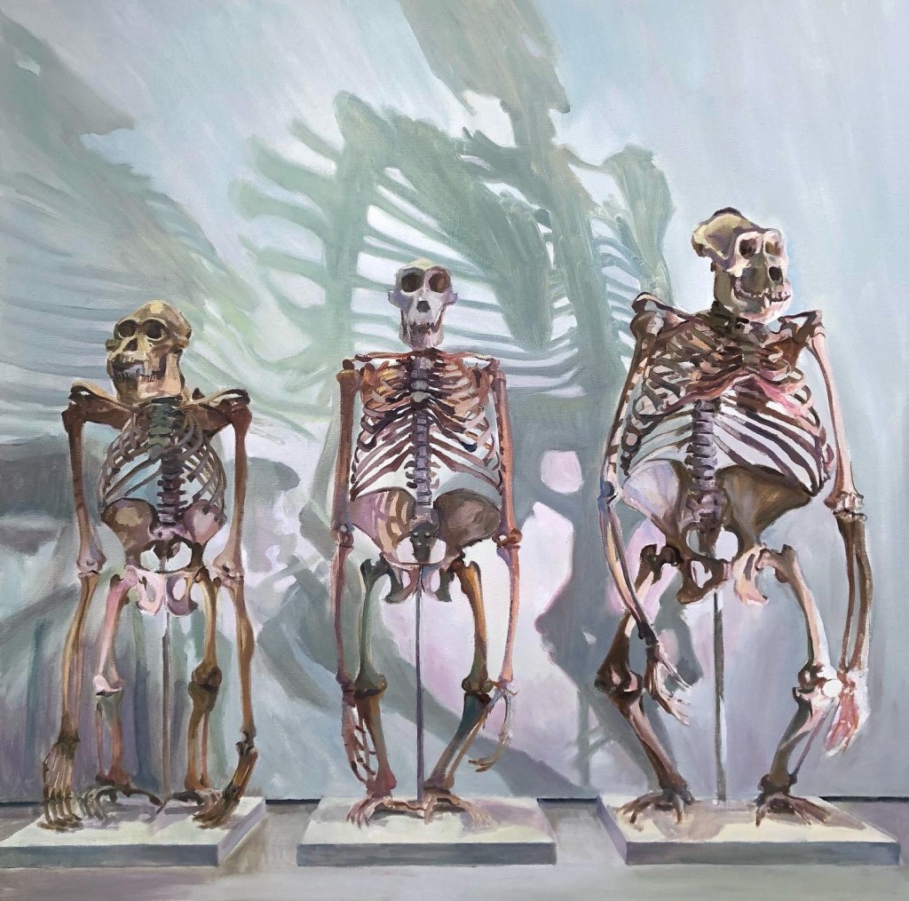 Study of orang-utan, female and male western gorilla skeletons in Cambridge Zoology Museum.